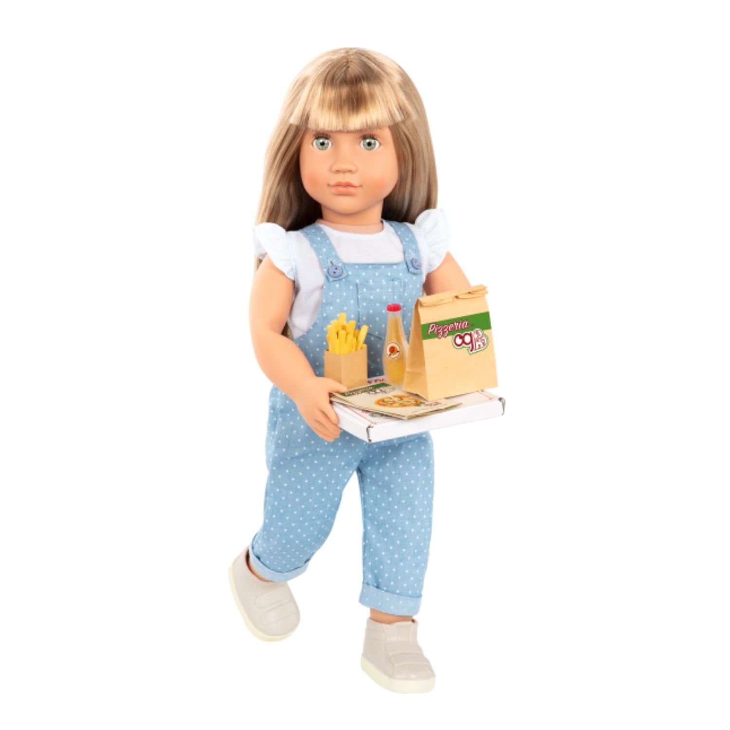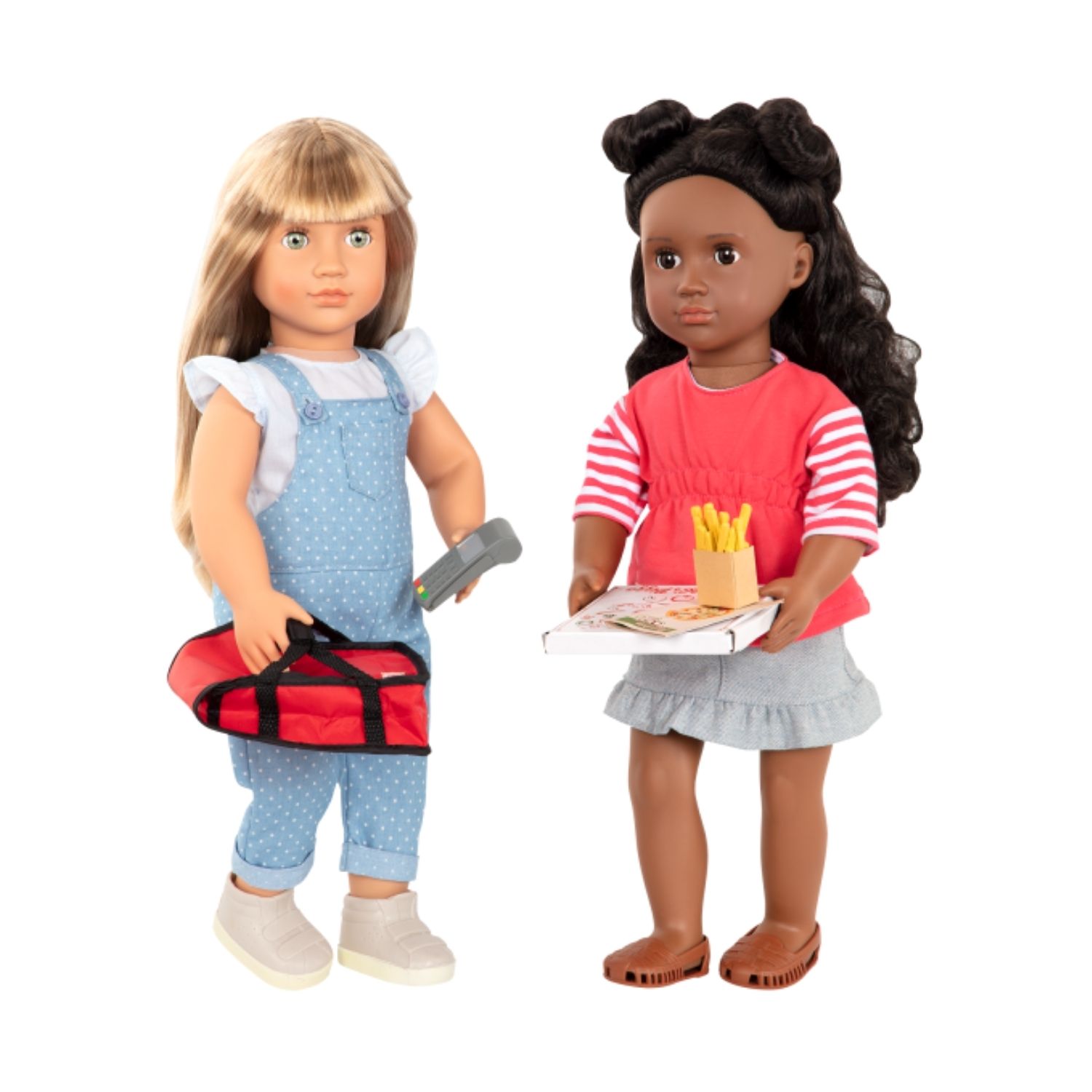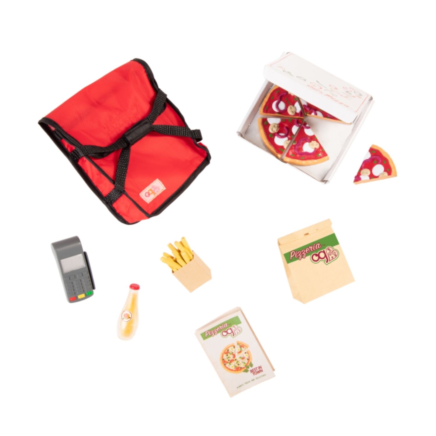 Deliver your doll’s favorite party food with the Our Generation Order’s Up pizza set! Put in a call to the nearest pizzeria and order a delicious pizza pie for your next slumber party, movie night, or to fill up your bestie’s hungry tummy. Choose your toppings from the menu options and prepare the order for delivery – you can play as customer and vendor! Pack up the pizza in the pizza box and place it inside the delivery bag so your dolls can carry it to their destination. Ring! Ring! Pizza’s here! Use the payment terminal accessory to make realistic transactions. Then open up the pizza box and hand out the 6 removable slices to each of your friends when it’s time to feast. Don’t forget the French fries! They easily fit in the brown paper bag with the juice bottle to give your dolls a refreshing drink and yummy combo. Parties are extra fun when pizza is on the menu!