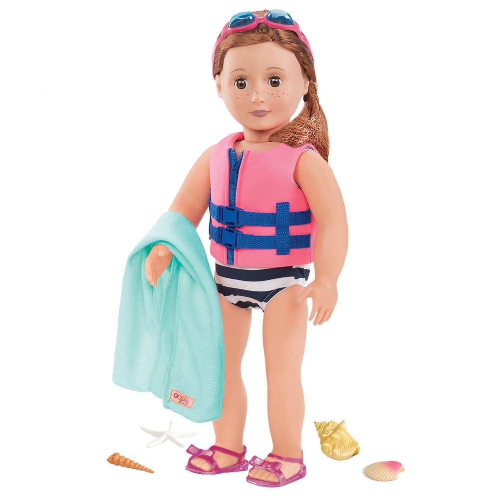Dress your dolls in the classic striped swimsuit. The pink jelly sandals are great for walking on the beach or the boardwalk! Go hunting for seashells and see what your dolls can find! The pink life vest will keep your dolls safe while they explore the deeper water, in the ocean or the pool, and the cute pink goggles will help them see clearly without getting water in their eyes. After your splish-splash fun is done, use the beach towel to dry off. (Just remember – the best swimming for your dolls is pretend! Please don’t get your Our Generation dolls wet or put them in real water!)